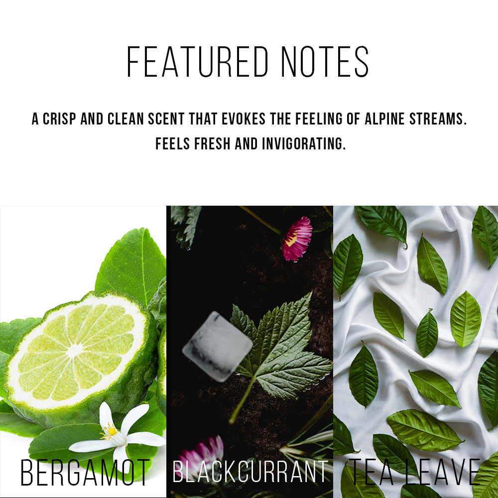 - Features Mandarin, Green Tea, and Blackcurrant, evoking pristine landscapes.